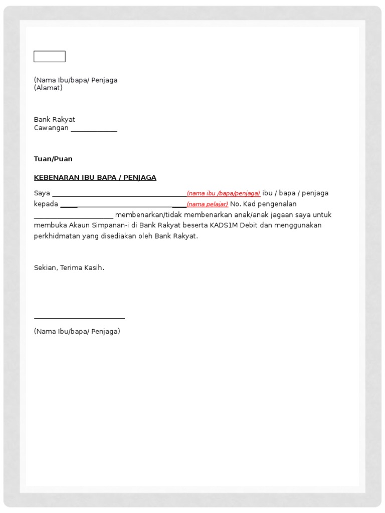 Bank Rakyat Surat Kebenaran Ibubapa. Anda mungkin perlu mempelajari teknik yang berbeza untuk menulis surat dalam ini era digital di mana mesej teks dan e-mel telah menggantikan surat perniagaan rasmi. Ia semata-mata bergantung pada jenis surat bahawa kandungan yang ada untuk diletakkan atau diberi penekanan dalam perenggan utama surat itu.